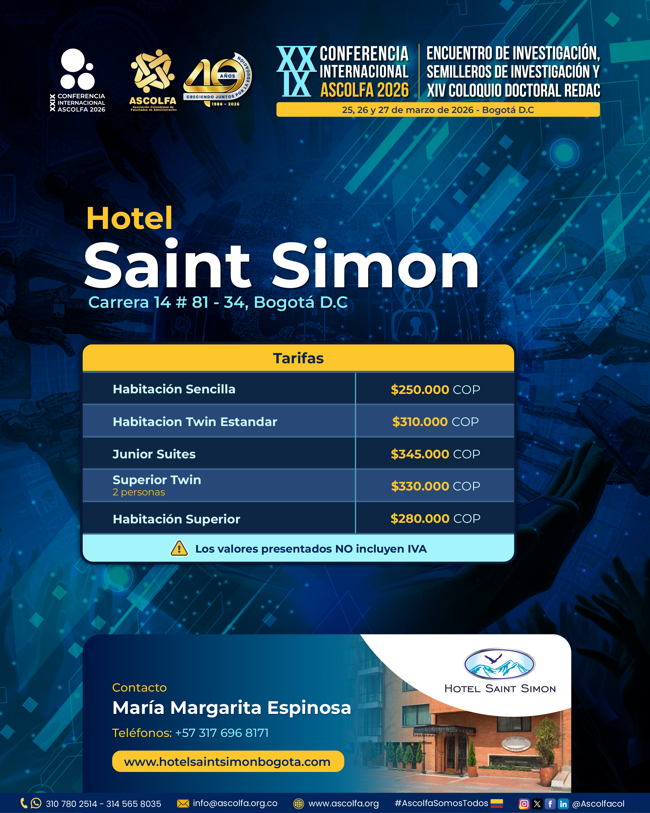 Encuentra el hotel ideal para tu estadía durante nuestra XXIX Conferencia Internacional ASCOLFA 2026, Encuentro de Investigación, Semilleros de Investigación y XIV Coloquio Doctoral REDAC. ¡Consulta nuestra guía de hoteles los cuales tienen tarifas preferenciales para nuestros asistentes!
