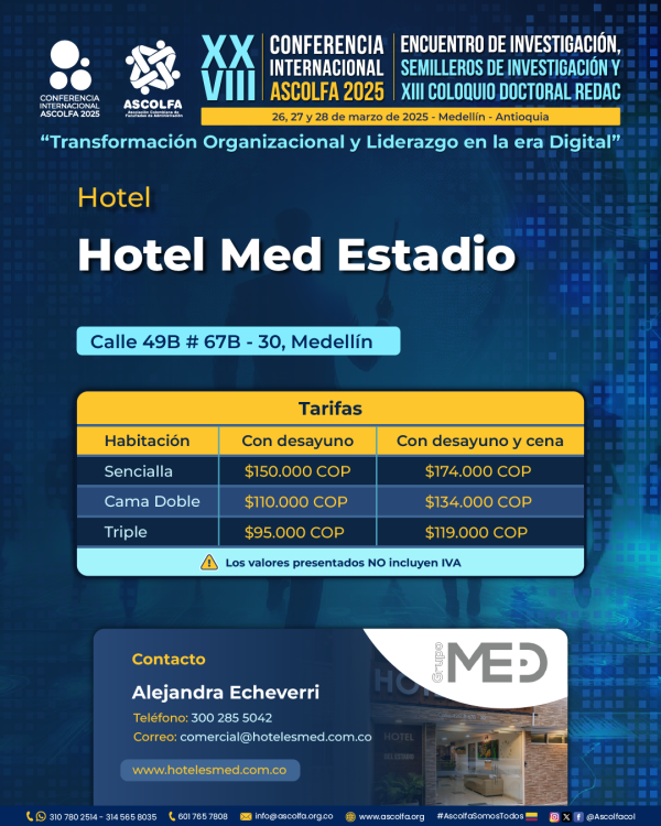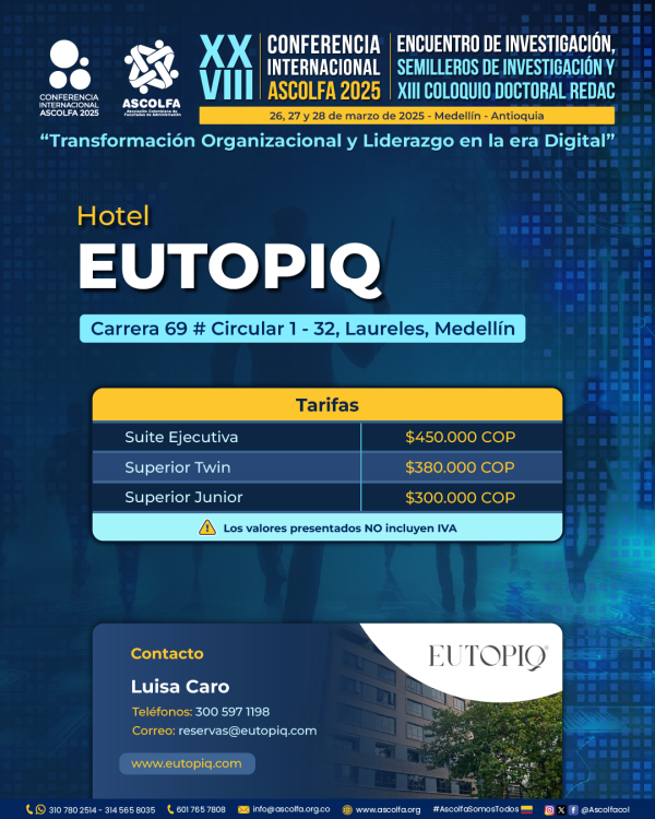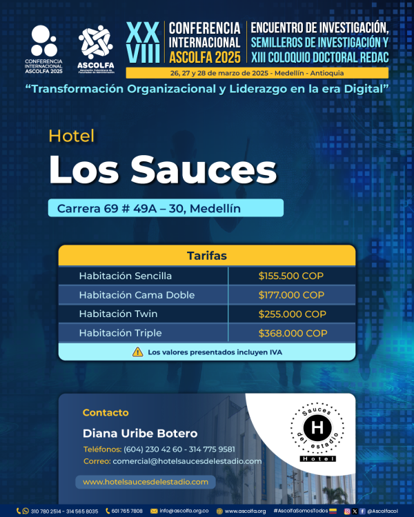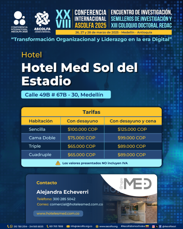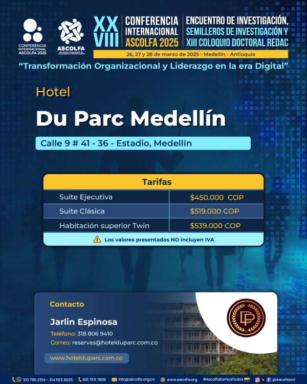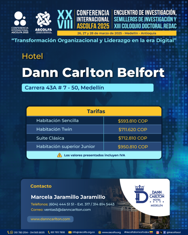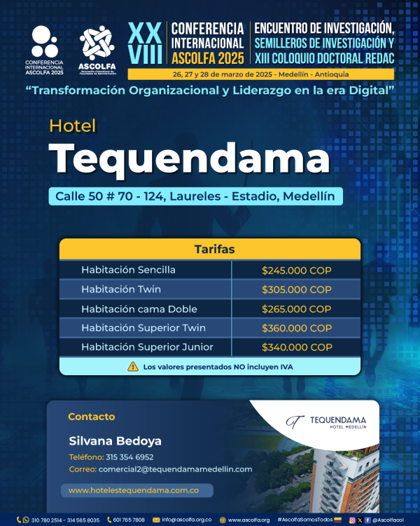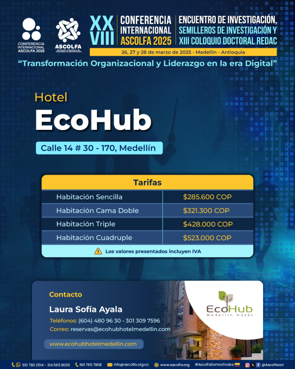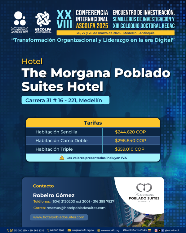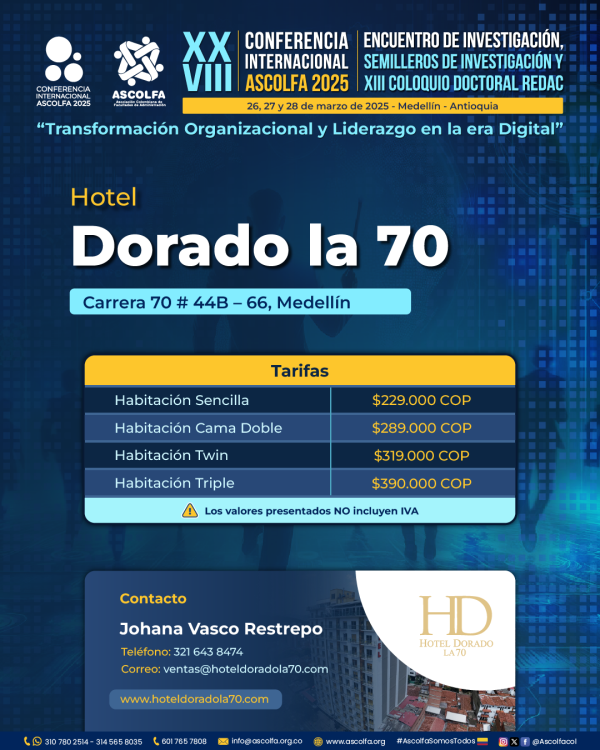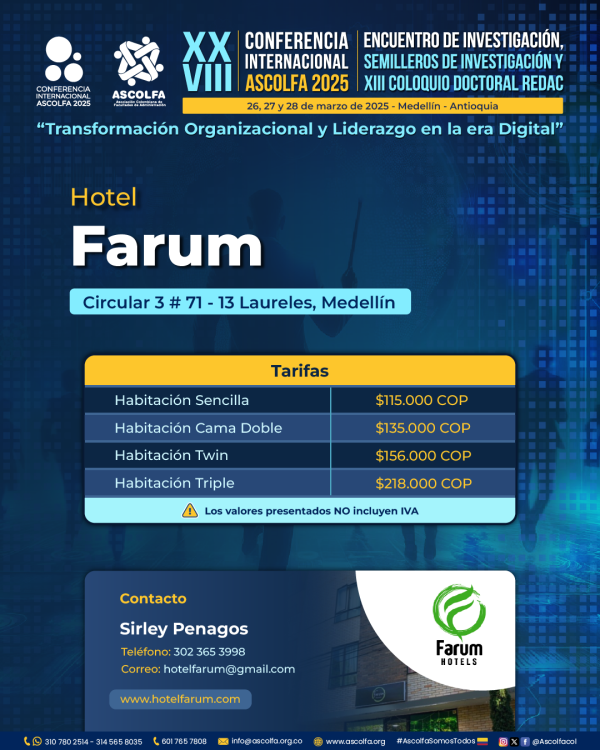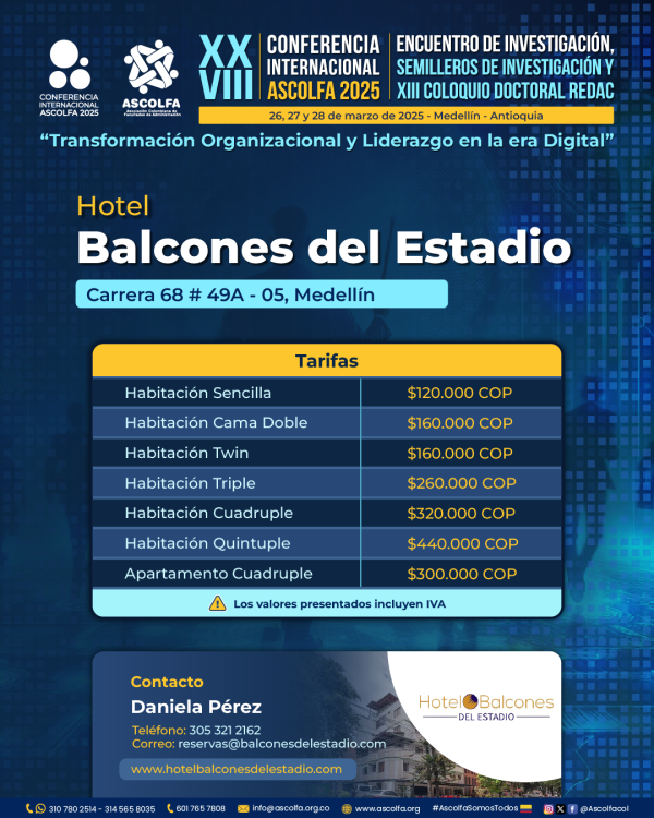 Encuentra el hotel ideal para tu estadía durante nuestra XXVIII Conferencia Internacional ASCOLFA 2025, Encuentro de Investigación, Semilleros de Investigación y XIII Coloquio Doctoral REDAC. ¡Consulta nuestra guía de hoteles los cuales tienen tarifas preferenciales para nuestros asistentes!